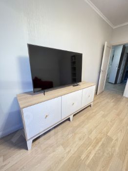 — Просторная гостиная, оборудована большим ортопедическим диваном. Раскладывается в большое спальное место. Вместительные шкафы, большой телевизор последнего поколения.
