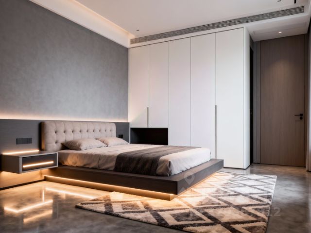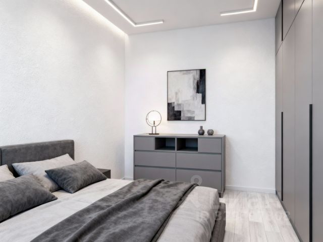 Спальня (17 кв.м): двухспальная кровать с 2мя тумбочками, комодом, туалетным столиком с зеркалом и креслом. Шторы с блэкаутами.