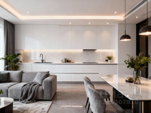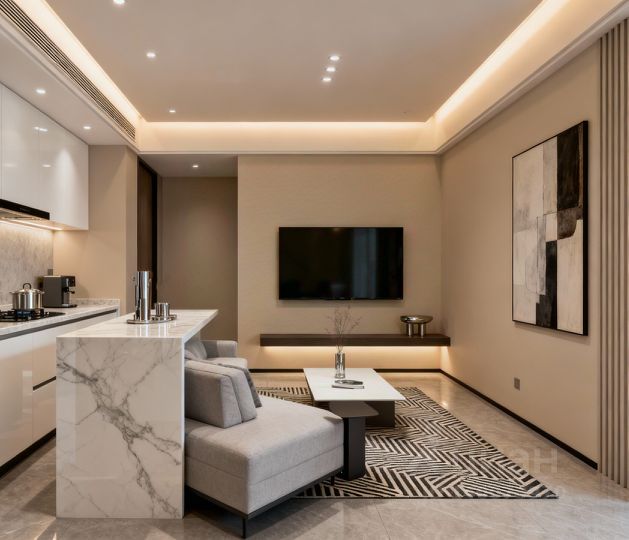 Прихожая (12 кв.м), Гардеробная (5 кв.м), Ванная (7 кв.м), Зал-кухня (24 кв.м): современная кухня с резным порталом и выездными колонами, встроенной техникой (стиральная машина, посудомоечная машина, индукционная плита, духовой шкаф, холодильник, вытяжка), обеденным столом, мягкой зоной с раскладным диваном на двоих, журнальным столом, тв-тумбой и телевизором.