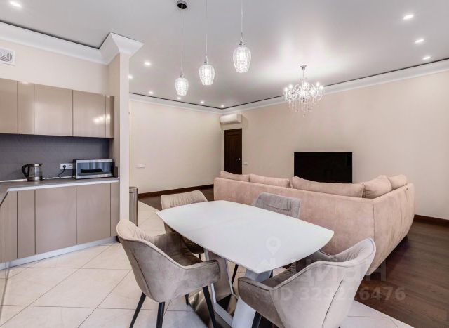 - полностью укомплектован всей необходимой бытовой техникой, включая холодильник, СМА, посудомоечную машину, свч, телевизор с диагональю 65" и т.д.,