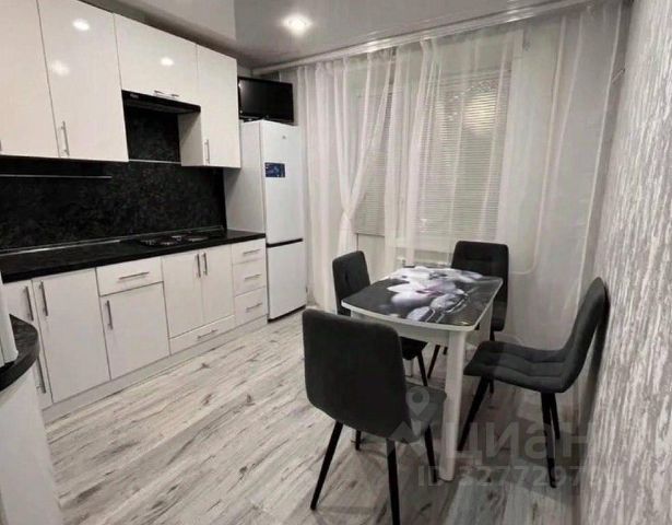Кухонный гарнитур , встроенной техникой (ЭЛЕКТРИЧЕСКАЯ варочная панель и духовой шкаф, микроволновая печь, холодильник ) обеденный стол с мягкими стульями.