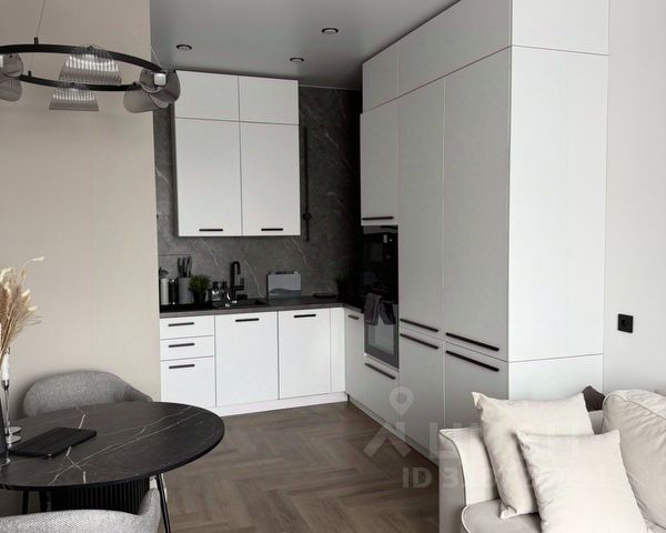 кухонный гарнитур со встроенной индукционной варочной панелью и конвекционным духовым шкафом, холодильник (Total NoFrost), микроволновая печь, вытяжка, кондиционер, двуспальная кровать с ортопедическим матрасом и коробом для хранения вещей, шкаф-купе, полноценное рабочее место (компьютерный стол и стул), шторы blackout, двухспальный ортопедический раскладывающийся диван (еврокнижка), обеденный раздвижной стол, стулья, стиральная машина, электрический полотенцесушитель с таймером отключения, раздвижная сушилка для белья, прихожая, пуфик, интернет: Wi-Fi.
