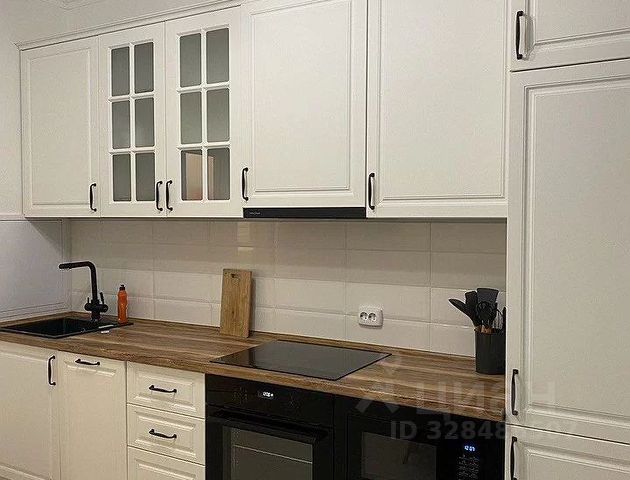 В квартире есть: холодильник, плита, СВЧ, вытяжка, телевизор, стиральная машинка.