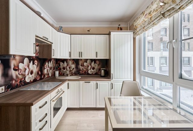 - Полностью оборудованная кухня (индукционная плита, духовой шкаф, вытяжка, посудомоечная машина, холодильник, электрочайник)