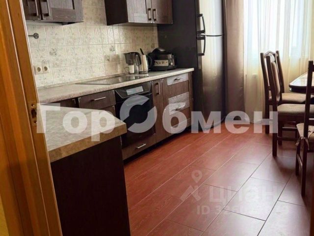 Кухонный гарнитур с доводчиками дверей в светлых тонах, столешница сделана из искусственного камня. Техника встроенная: варочная панель, духовой шкаф, микроволновка, вытяжка. Холодильник 2-х камерный, стоит в нише в прихожей, но можно его по желанию переместить на кухню. Обеденный стол, стулья. Выход на балкон с кухни. Окна на улицу. В комнате диван, тумба под телевизор, телевизор с плоским экраном. ПРИХОЖАЯ: