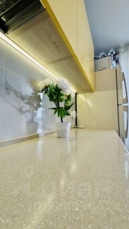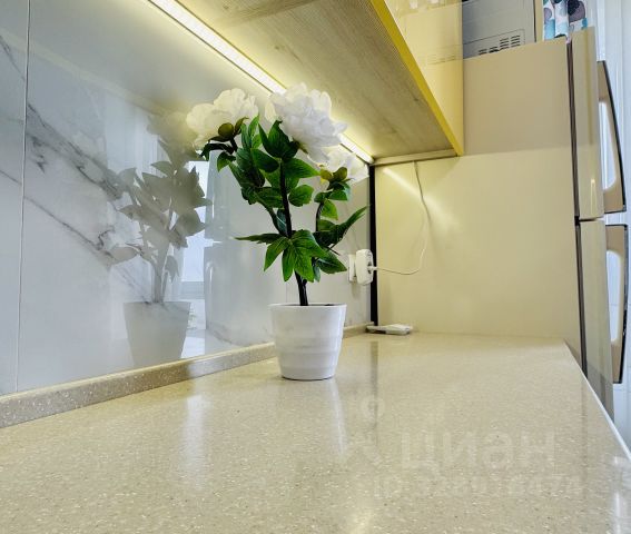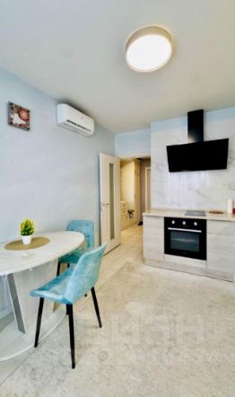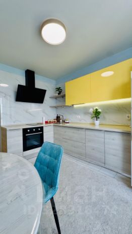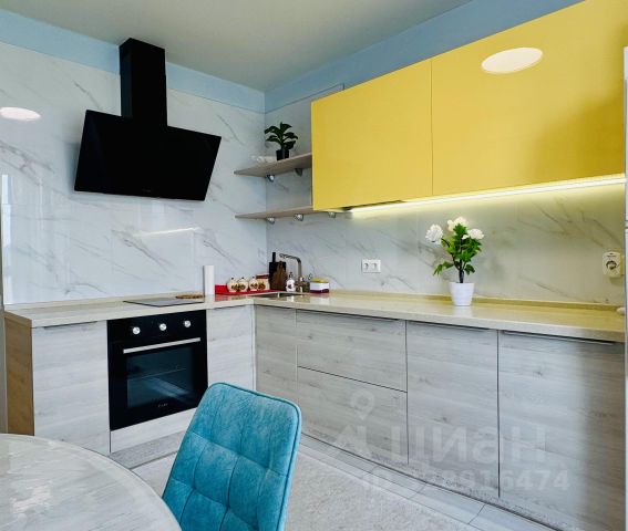 В кухне полноценный угловой гарнитур со встроенной техникой: варочная панель (стеклокерамика), духовка, вытяжка. Холодильник, чайник. Круглый стеклянный стол + 4 стула.