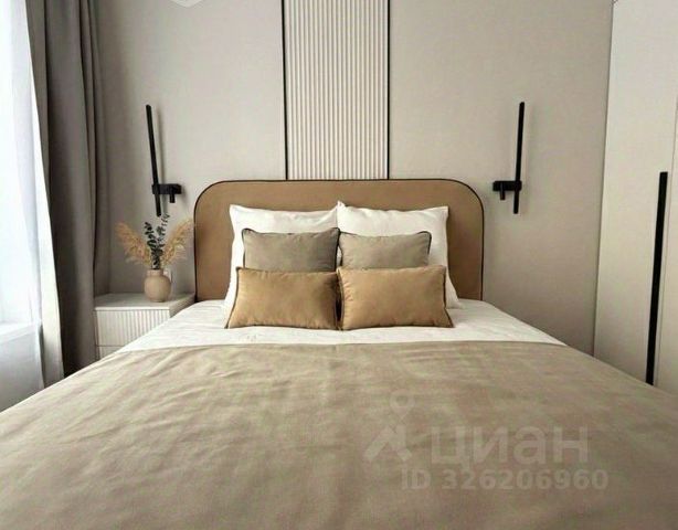 В спальне расположен большой шкаф, кровать с подъемным механизмом и спальным местом 160*200, прикроватные столик и тумба, каменные бра. Во всех комнатах установлены закарнизные ниши для гардин.