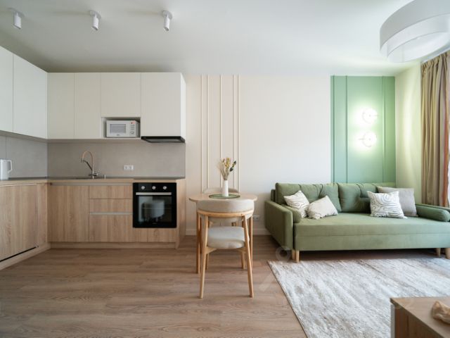В гостинной есть просторный диван, телевизор и рабочая зона. В обеденной зоне расположен круглый обеденный стол из массива дуба и стулья с поворотным механизмом.
