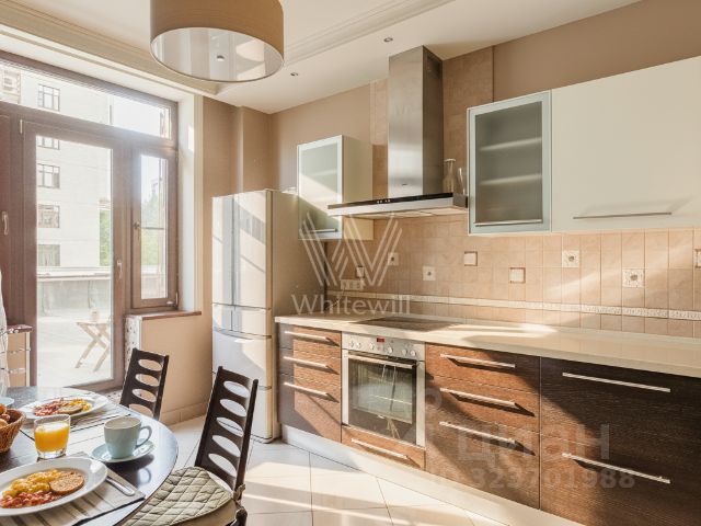 Кухня: итальянский гарнитур из массива в классическом стиле, столешница из чёрного камня, встроенный холодильник с ледогенератором Liebherr, варочная панель и духовка Bosch , посудомоечная машина Electrolux. Стоит новая очистная система воды. Эффектная люстра из чёрного стёкла. Шторы на заказ.