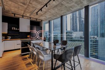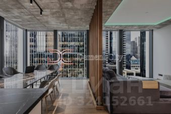 Главное об апартаментах: 31 этаж, 70 метров, кухня-гостиная, спальня, ванная, гардеробная. Мебель Garda Decor, системы хранения изготовлены на заказ, установлена система кондиционирования. Идеальны для одного или пары.