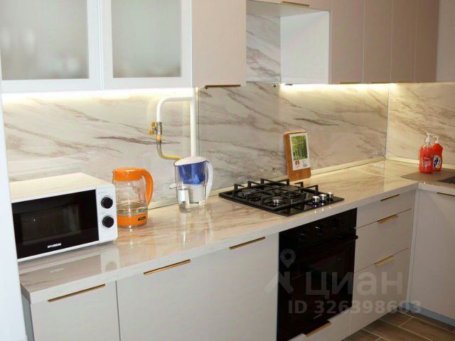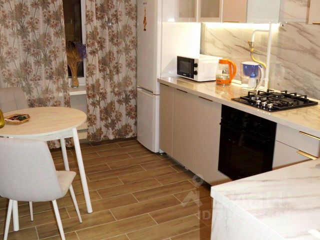Кухня из натурального дерева. Большая каменная мойка, посудомоечная машинка Сименс. Холодильник Либхер. Газовые варочная панель и духовой шкаф. Тахта, на которой уютно смотреть телевизор. Большое окно, большой подоконник шириной 60 см и длиной 2 метра. Деревянный стеклопакет и деревянные жалюзи.