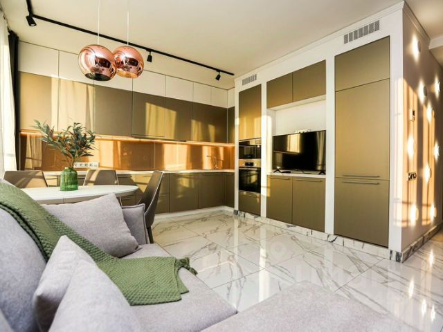 Просторное пространство для ваших посиделок. Большой диван, полноценный обеденный стол, кухня с техникой (плита, духовка, холодильник, вытяжка). Можно готовить, принимать гостей и смотреть кино — не мешая друг другу.