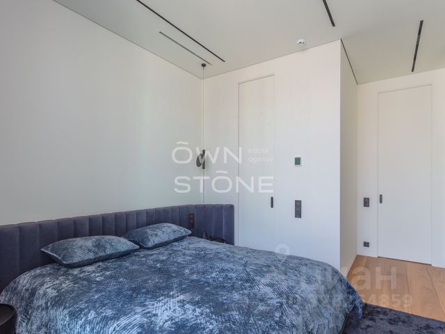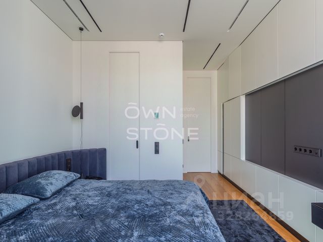 В спальне стоит двуспальная кожаная кровать, две прикроватные тумбочки и просторный шкаф Rimadesio.