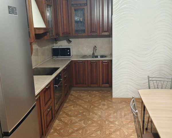 Техника: большой встроенный двухдверный холодильник с морозилкой, индукционная плита, духовка, вытяжка, микроволновка, RGB-подсветка, посудомоечная машина и увлажнитель с подключением к Умному дому, стиральная машина, телевизор, , зеркало с подсветкой в ванной.