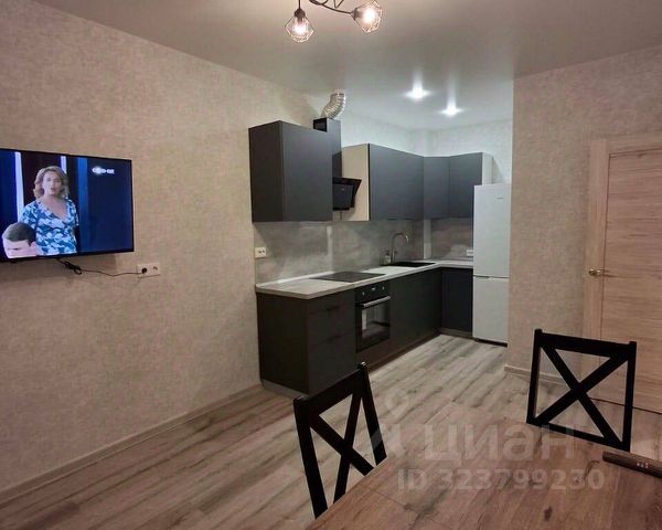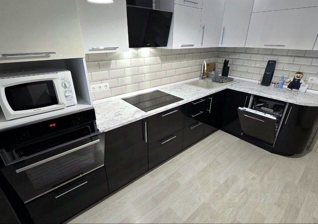 Кухня с выходом на застекленную лоджию, встроенная техника: посудомоечная машина. духовой шкаф, стеклокерамическая варочная панель, вытяжка, холодильник, телевизор Смарт ТВ.