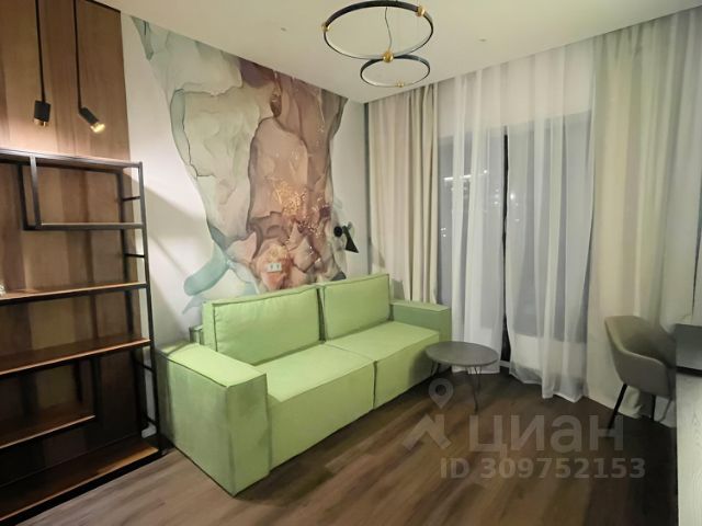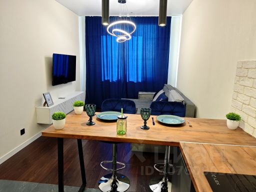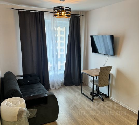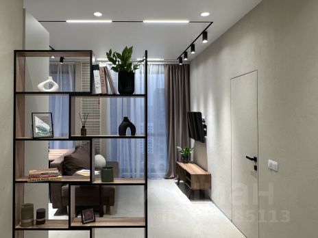 Гостиная - диван раскладывается в полноценное спальное место, туалетный стол, телевизор, тумбы под тв, стеллаж, разделена с кухней раздвижной перегородкой каскадного типа - можно полностью закрыть и будет отдельная вторая комната.