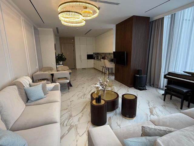 Функциональная планировка квартиры, разработанная по индивидуальному дизайн-проекту: просторная кухня-гостиная, изолированная мастер-спальня со своим санузлом, отдельная гардеробная комната, второй совмещенный санузел, лоджия с панорамным остеклением, просторный холл.