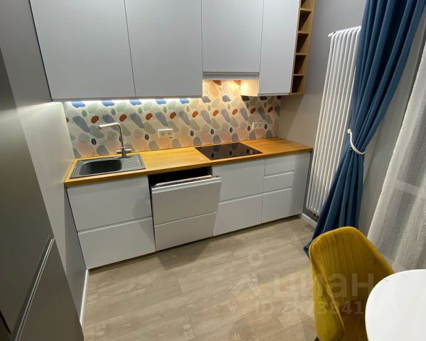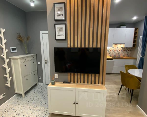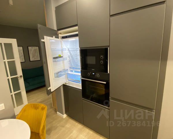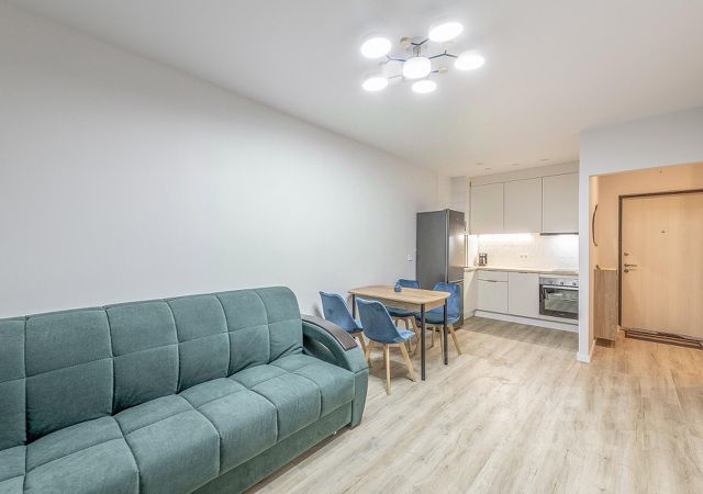 Одна изолированная спальная комната, в ней 2-спальная кровать с качественным матрасом, гардеробный шкаф. Кухня-гостиная с выходом на лоджию, здесь стильный светлый гарнитур со встроенной техникой (варочная панель, духовка, СВЧ, посудомоечная машинка, вытяжка), обеденная группа, новый диван-книжка, установлен кондиционер. Большая гардеробная комната (освободят от строит.материалов). Санузел совмещенный, стиральная машинка-автомат, полка для хранения вещей, зеркало с подсветкой. Уютная прихожая с полками и пуфом.