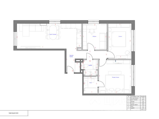 Квартира с функциональной планировкой, распашонка, окна смотрят во двор, 3 изолированные комнаты, мастер спальня, оборудована собственным санузлом и ванной -17,2 кв.м., спальня 12,8 кв.м., кабинет 9,95 кв.м. Высота потолков 3 метра, современная кухня-гостиная 25,1 кв.м. Второй санузел (гостевой), оборудован душевой кабиной.