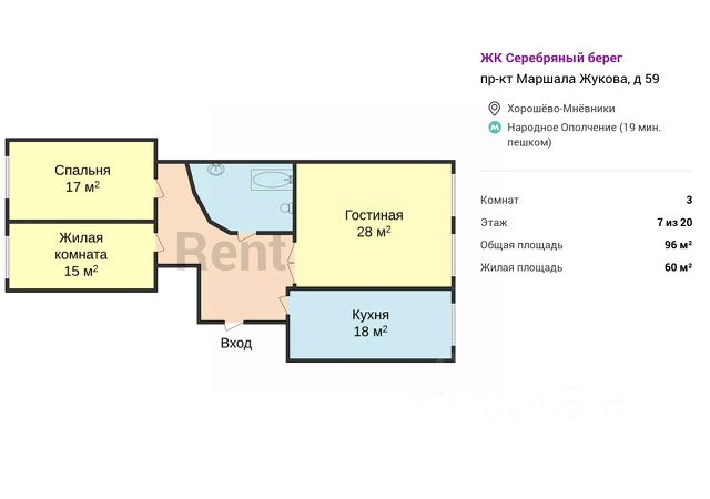 Сдается просторная трехкомнатная квартира с евро ремонтом на длительный срок. Залог составляет 130,000 рублей. Коммунальные услуги оплачиваются по счетчикам арендатором. Разрешено проживание с детьми и животными. Квартира расположена на 18 этаже монолитного дома, построенного в 2022 году. В доме два пассажирских и два грузовых лифта. Из окон открывается приятный вид на город. В квартире изолированные комнаты, что обеспечивает комфорт и приватность. Просторная кухня площадью 12 м² оснащена необходимой бытовой техникой, включая холодильник и плиту. В гостиной установлен кондиционер, а также имеется удобный диван и вместительная книжная полка. Санузел раздельный, выполнен в светлых тонах. В спальне есть шкафы и удобная кровать. В коридоре установлены вместительные полки для хранения вещей. Парковка открытая во дворе. В шаговой доступности находятся все необходимые объекты инфраструктуры. 3-комнатная квартира (с фото) от собственника на шоссе Коровинское в Москве на длительный срок.