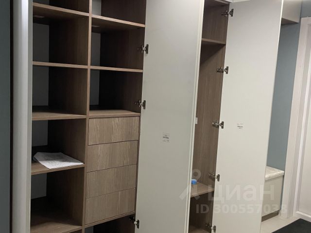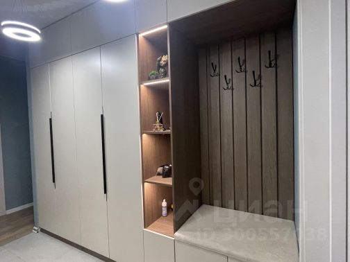 Дизайнерский вместительный шкаф с автоподсветкой в гардеробной.