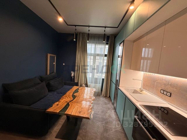 - Гостиная - совмещенная с кухней, полностью мебелирована, с большим телевизором 55 дюймов. Выход в застекленную лоджию с панорамными окнами.