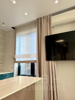 Кухня-гостиная — сердце квартиры: просторное помещение с панорамными окнами, центральный остров, за которым удобно готовить или пить кофе с видом на реку. Всё уже есть: холодильник, духовка, микроволновая печь, посудомоечная машина, стеклянный шкаф, круглый стол на шестерых и диван с раскладным механизмом. Сценарное освещение меняет атмосферу одним нажатием — от яркого света до тёплого полумрака.