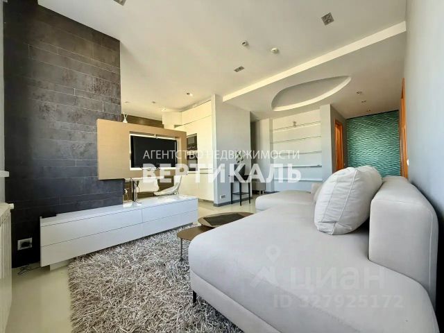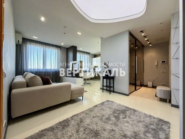 Продуманная планировка: кухнягостиная около 28 м², две изолированные комнаты, два санузла (ванна и душ), гардеробная и кладовая. Квартира полностью меблирована, кухня со встроенной техникой (духовой шкаф, варочная панель, посудомоечная машина, холодильник), в одной комнате — спальня с двуспальной кроватью, в другой — кабинет/гардеробная; установлены кондиционеры и много систем хранения. В одном санузле ванна и стиральная машина, во втором — душевая кабина.
