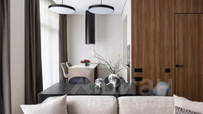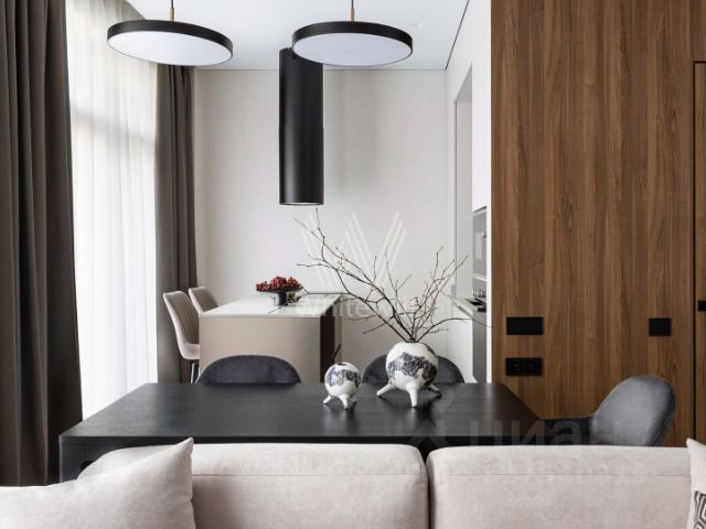 Встроенная техника, стеклянный шкаф с посудой, круглый стол на шесть персон и мягкий диван с раскладным механизмом - всё уже готово к повседневности и праздникам. Атмосферу меняет сценарное освещение: одним нажатием пространство становится то ярким и рабочим, то мягким и вечерним.