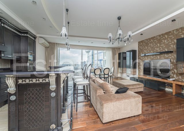 Квартира с отделкой в современном стиле: кухня-гостиная, 2 спальни, 2 санузла, гардеробная. Открытый панорамный вид на заказник Долина реки Сетунь . В отделке использован натуральный камень, веницианская штукатурка, дорогой паркет. Сантехника Hoesh, кухня Berloni.