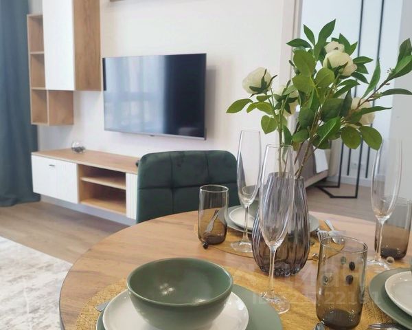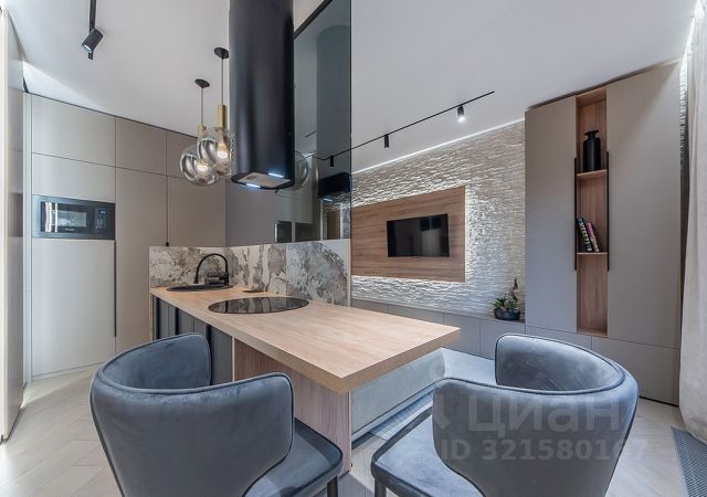 На кухне встроенный кухонный гарнитур из массива бука, качественная стеклокерамическая плита, СВЧ, вытяжка, духовой шкаф, большой современный холодильник, дополнительная центральная вентиляция. Есть необходимая посуда и столовые принадлежности.