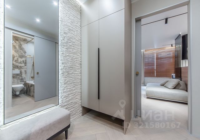 В коридоре большой четырёхстворчатый зеркальный шкаф-купе, мощный пылесос.