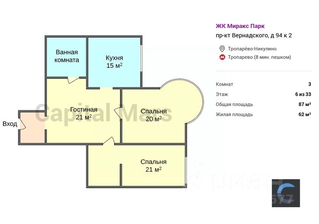 Уютная квартира с двумя спальнями в комплексе премиум-класса "Миракс Парк" рядом с Тропарёвским прудом на юго-западе Москвы. Интерьер оформлен в стиле итальянской классики в приятных светлых тонах. Спланирована гостиная, кухня-столовая, спальня с полукруглым панорамным эркером, вторая спальня с зоной кабинета, ванная комната с большой угловой ванной. Квартира укомплектована мебелью и бытовой техникой. Установлена система кондиционирования, стиральная и посудомоечная машины. Из окон открывается вид на пруд и в приватный двор. В стоимость входит машиноместо. Комментарий эксперта. Меня зовут Артем Петров — брокер компании Whitewill. Я отвечаю за аренду этого лота. Свяжитесь со мной, чтобы получить расширенную презентацию, больше фотографий или договориться о просмотре. Могу провести экскурсию по локации и познакомить вас с этим домом. ID 4 331. 3-комнатная квартира на проспекте Вернадского в Москве.