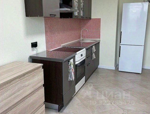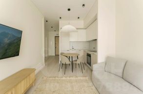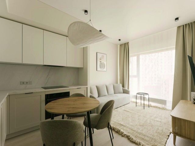 Кухня-гостиная: кухня со встроенной посудомоечной машиной, холодильником, СВЧ, варочной панелью, духовыми шкафом, обеденная группа с раскладным столом и ТВ-зоной, раскладной диван. Также можно добавить кресло для доп. зоны отдыха.