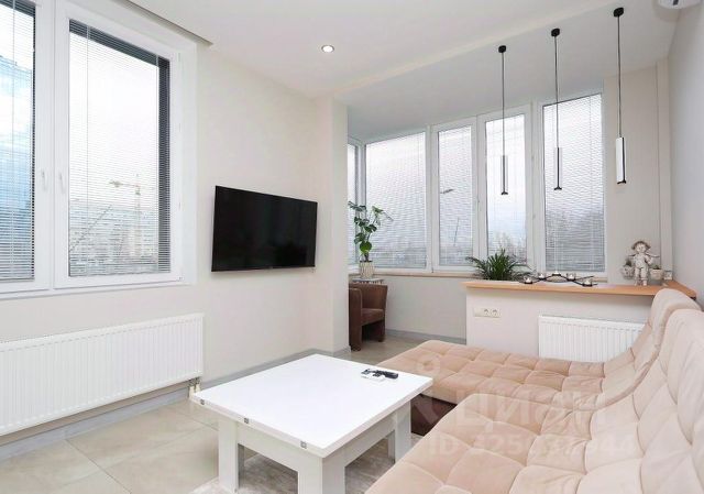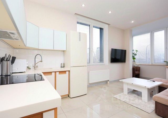 - Кухня-гостиная с раскладным Г-образным диваном, барной мраморной стойкой и домашний кинотеатр с проектором