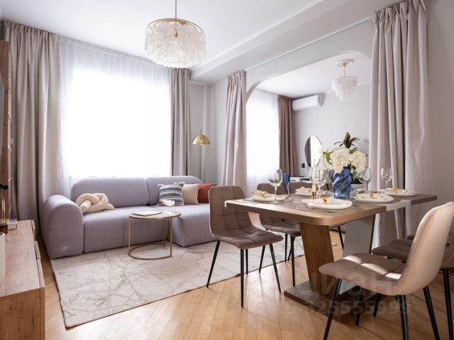 Площадь квартиры 73 квадратных метра, в ней много света и воздуха благодаря 8 большим окнам и потолкам 3,2 м. Два кондиционера помогут создать комфортный климат.