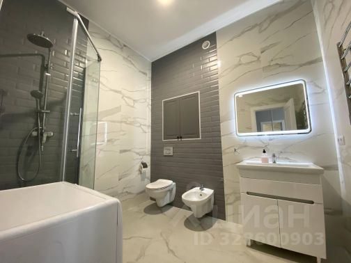 Совмещенный санузел премиум-класса: Гидромассажная ванна и душевая кабина, стиральная машина с сушкой, теплый пол, система защиты от протечек.