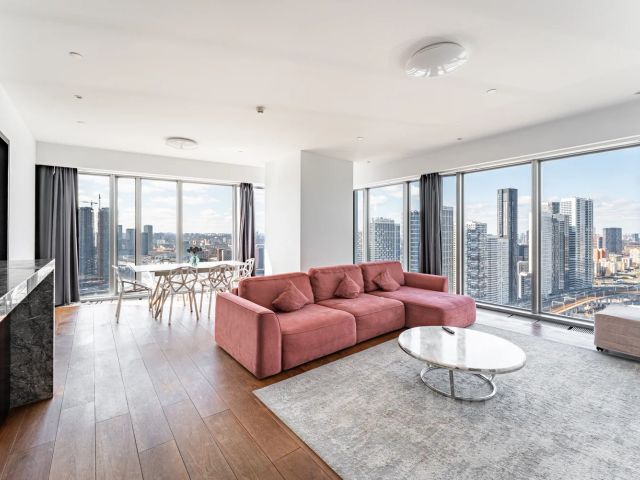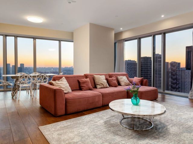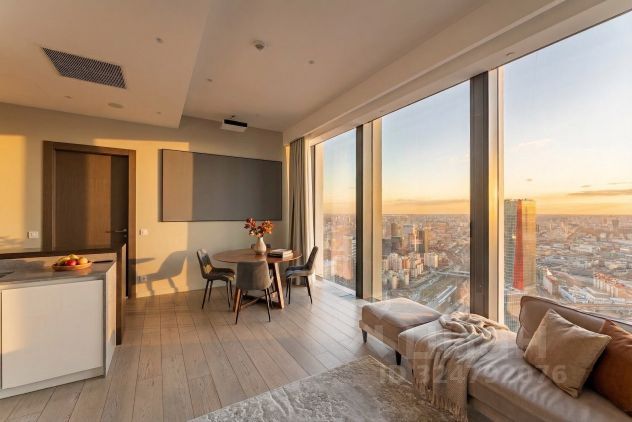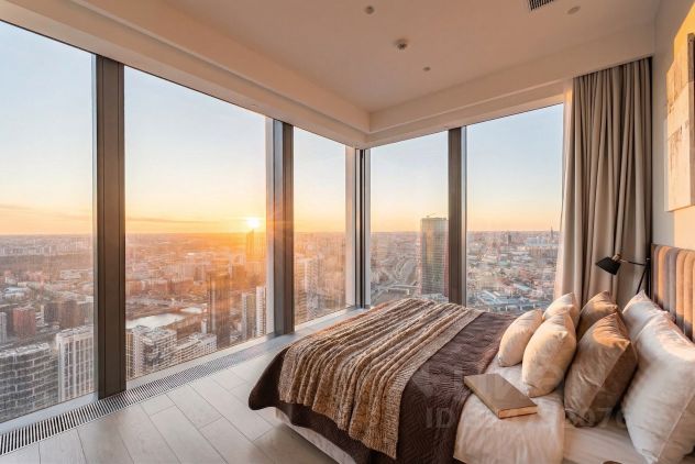 Просторный апартамент расположился на 63 этаже башни ОКО, он вмещает 2 полноценные спальни с собственными санузлами (одна из них с той самой панорамной ванной у окна, одна мысль о фото в которой сводит девушек с ума), просторную угловую гостиную для Ваших встреч и посиделок с друзьями и зону кухни-гостиной для welcome drink или кулинарных шедевров.