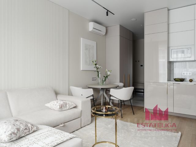 Квартира оформлена в минималистичном стиле: светлые бело-серые оттенки, аккуратная мебель и ненавязчивый декор создают ощущение простора и уюта. Планировка продумана и функциональна. В спальне оборудована комфортная зона отдыха с удобной кроватью и телевизором, есть вместительный шкаф и комод для хранения, а также полноценное рабочее место. Зеркало в полный рост и туалетный столик делают утренние сборы особенно удобными.