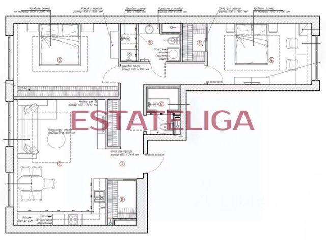 Функциональная планировка квартиры: просторная гостиная, плавно перетекающая в кухню, просторная спальная комната, вторая спальная комната с рабочей зоной и гардеробной, два совмещенных санузла, один из них с полноценным хаммамом, холл с местами для хранения, отдельная гостевая гардеробная.