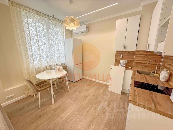 В просторной кухне, совмещенной с гостиной - функциональное рабочее место, оснащенное современной бытовой техникой, включая духовую печь, варочную панель и посудомоечную машину под единой столешницей, встроенную СВЧ, вытяжку, двухкамерный двухдверный холодильник. Большое рабочее пространство для приготовления с барной стойкой. ЖК телевизор. Отдельная обеденная зона. Выход на огромную застекленную лоджию.