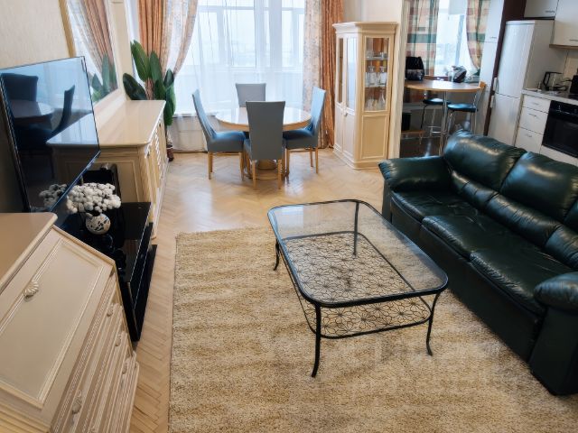Просторная зона с диванами (Франция), мебелью и обеденной группой (Италия), телевизор 60, музыкальный центр Yamaha с Bluetooth, кондиционер.