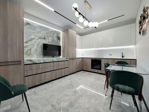 5.Полноценная кухня с большой рабочей зоной из кварца, множеством мест хранения и оборудования: 2 холодильника, посудомойка 60см, измельчитель бытовых отходов, фильтра для очистки питьевой воды, вся техника премиальных европейских брендов.