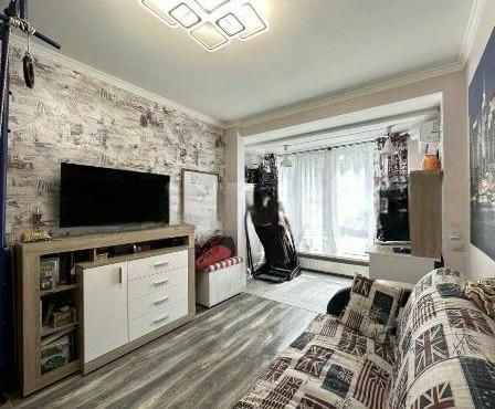 - просторная гостиная с выходом на утепленный балкон, диван в гостинной оснащен системой