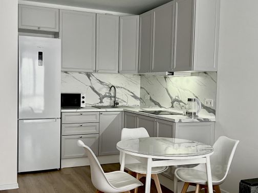 Квартира с дизайнерским ремонтом, готова к комфортному проживанию. В просторной кухне площадью 10 кв. м установлена современная мебель и техника: холодильник, посудомоечная машина, плита, духовка, вытяжка, микроволновая печь, чайник. Кухню и гостиную разделяет барная стойка, очень уютная видовая обеденная зона. В комнатах также есть необходимая мебель, поэтому можно сразу заселяться. В квартире установлен кондиционер в каждой комнате, а также телевизор для вашего удобства и отдыха. в спальне окна на обе стороны, с видом на лес. Санузел совмещённый, оборудован ванной, также определенной изюминкой является окно. Есть отдельная гардеробная зона, а также комната-кладовка, где есть стиральная машина, утюг, гладильная доска и места для хранения.