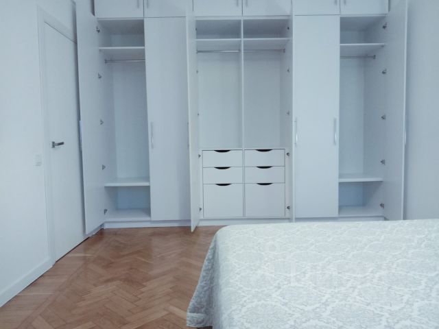 Спальня: двуспальная кровать с новым ортопедическим матрасом, шкафы, трюмо с зеркалом.