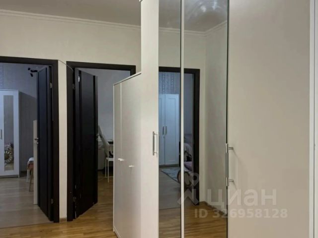 Просторная коридорная зона с большим количеством встроенных зеркальных шкафов.