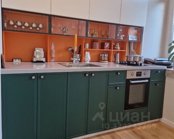 Кухня- настоящий рай для кулинара - оборудована практичной мебелью с встроенной техникой: варочная панель, духовка, вытяжка, посудомоечная машина (все -Electrolux), холодильник Liebherr. Кухня соединена с гостиной (17.7 кв.м), где разместились обеденный стол и гостевой гобеленовый диван, кондиционер, возможно установить телевизор и аудиосистему.