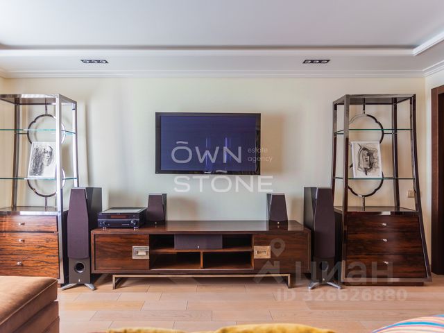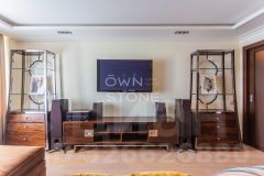 Гостиная: зона отдыха с большим раскладывающимся диваном на два спальных места, рабочий стол, встроенные шкафы для книг и хранения. Телевизор, домашний кинотеатр Wharfedale, ресивер Yamaha, проигрыватель Yamaha, кондиционер.
