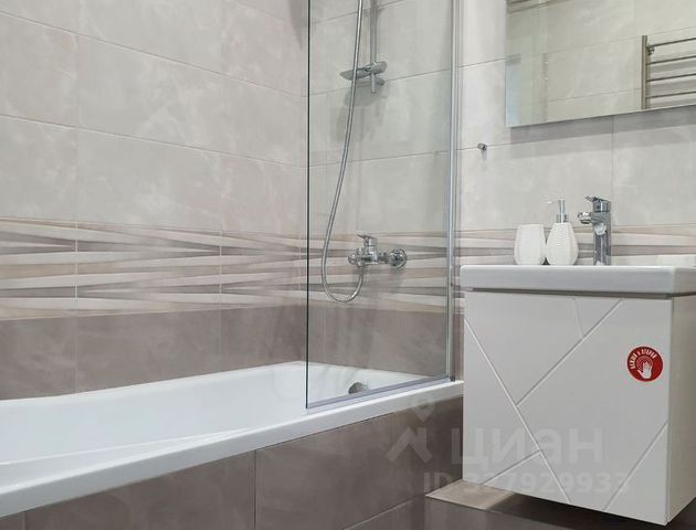 В ванной герметичная душевая кабина с тропическим душем и новая стиральная машина.